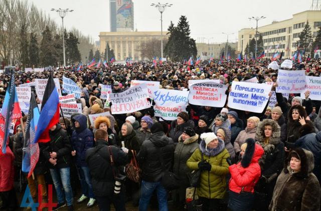 В оккупированном «ДНР» Донецке «власти» провели митинг во вторую годовщину подписания резолюции Совета Безопасности ООН по Украине в поддержку Минских соглашений.