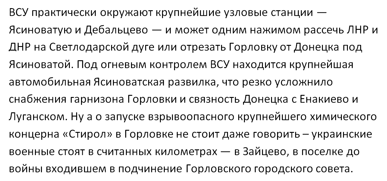 Украинская армия вплотную окружает крупнейшие узловые станции на Донбассе, имея стратегический контроль в предместье Ясиноватой и Дебальцево, и может одним ударом рассечь "ЛНР" и "ДНР" на Светлодарской дуге, отрезав и Горловку от Донецка под Ясиноватой.