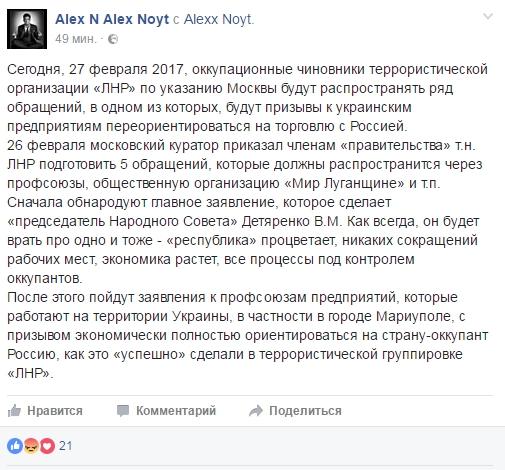 Украинский блогер под ником Alex N Alex Noyt написал у себя в Фейсбуке, что "чиновники ЛНР" получили приказ из Москвы призывать украинские предприятия переориентироваться на торговлю с Россией.