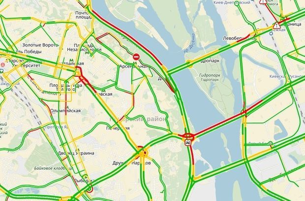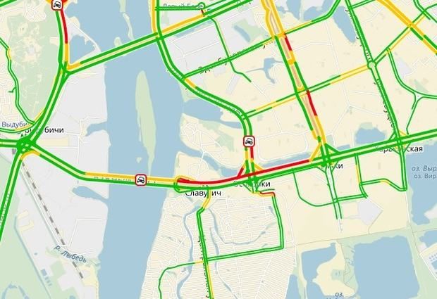 Пробки образовались и при въезде на Южный мост со стороны Осокорков, на проспекте Соборности при въезде на мост Патона и на самом мосту.