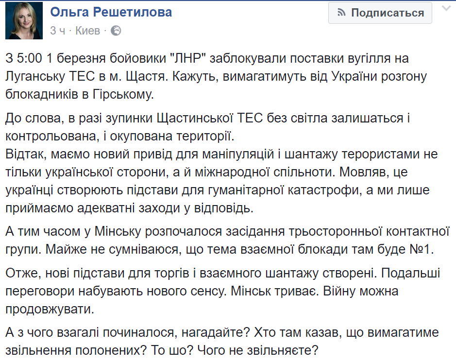 Сегодня утром террористы "ЛНР" заблокировали поставки угля на Луганскую ТЭС, которая расположена в городе Счастье. Таким образом, остаться без света рискуют жители как оккупированной боевиками территории, так и подконтрольной Украине части Донбасса.