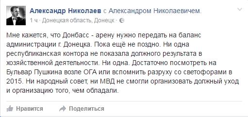Николаев предложил передать стадион на баланс “администрации г. Донецка”, так как за годы “хозяйствования” ни одна из структур “ДНР” не смогла содержать оккупированный город в порядке. Один из пользователей уточнил, что цена содержания “Донбасс Арены” - $18 млн в год, на что Николаев ему ответил, что о таких суммах речи быть не может.