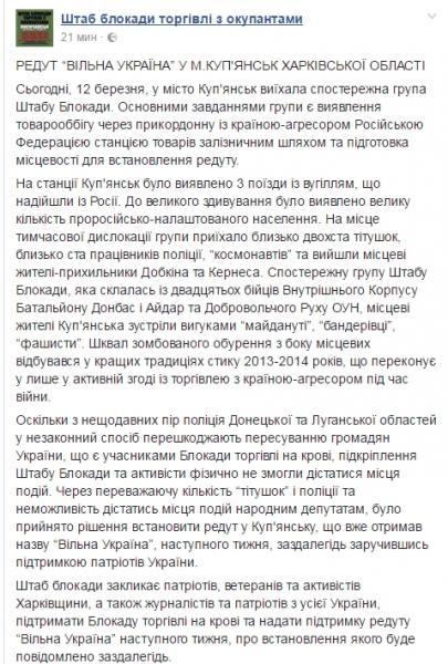 В сообщении сказано, что на станции Купянск было выявлено 3 поезда с углем, поступивших из России. К большому удивлению было обнаружено большое количество пророссийско настроенного населения. На место временной дислокации группы приехало около двухсот титушек, около ста сотрудников полиции, “космонавтов” и вышли местные жители-сторонники Добкина и Кернеса. Наблюдательную группу Штаба Блокады, которая состояла из двадцати бойцов Внутреннего Корпуса Батальона Донбасс и Айдар и Добровольческого Движения ОУН, местные жители Купянска встретили криками “майданутые”, “бандеровцы”, “фашисты”.