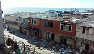 На видео видны разрушенные обстрелами жилые дома, пансионаты, кафе, магазины в прошлом курортного села Широкино. Также показан пустынный пустынный пляж Азовского моря.