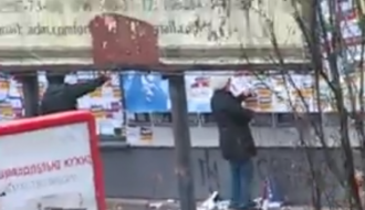 После акции, проведенной вчера «Национальным корпусом» в Краматорске, местные жители очищают «Сбербанк» от листовок и стикеров.