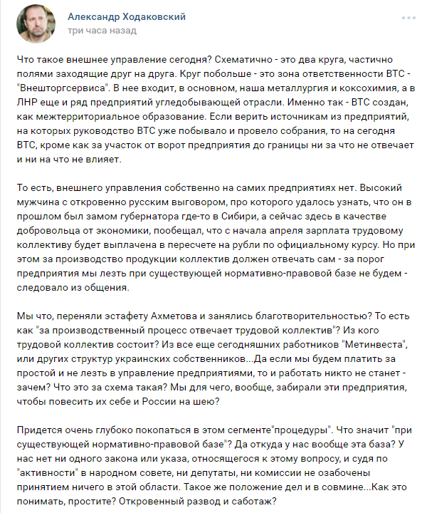 На своей странице в “ВК” Ходаковский пишет, что сегодня оккупанты “отжали” металлургию и коксохимию, шахты.