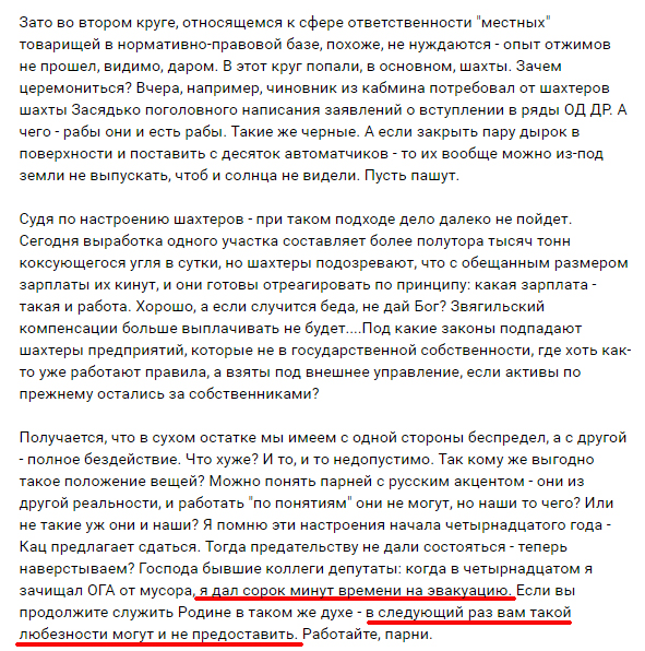“Получается, что в сухом остатке мы имеем, с одной стороны, беспредел, а с другой - полное бездействие... Так кому же выгодно такое положение вещей?... Я помню, эти настроения начала четырнадцатого года - Кац предлагает сдаться. Тогда предательству не дали состояться - теперь наверстываем? Господа бывшие коллеги депутаты, когда в четырнадцатом я зачищал ОГА от мусора, я дал сорок минут времени на эвакуацию. Если вы продолжите служить Родине в таком же духе, в следующий раз вам такой любезности могут и не предоставить”, - пригрозил Ходаковский.