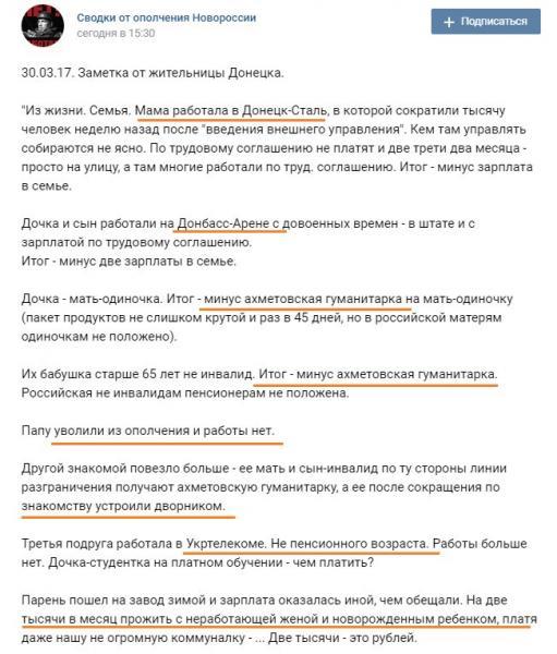 “Парень пошел на завод зимой и зарплата оказалась иной, чем обещали. На две тысячи в месяц прожить с неработающей женой и новорожденным ребенком ... Две тысячи - это рублей”, - пишет в паблике оккупантов местная жительница. Женщина пишет, что после массовых увольнений люди стали понимать, что “Донецк приговорен к разрухе и голоду".