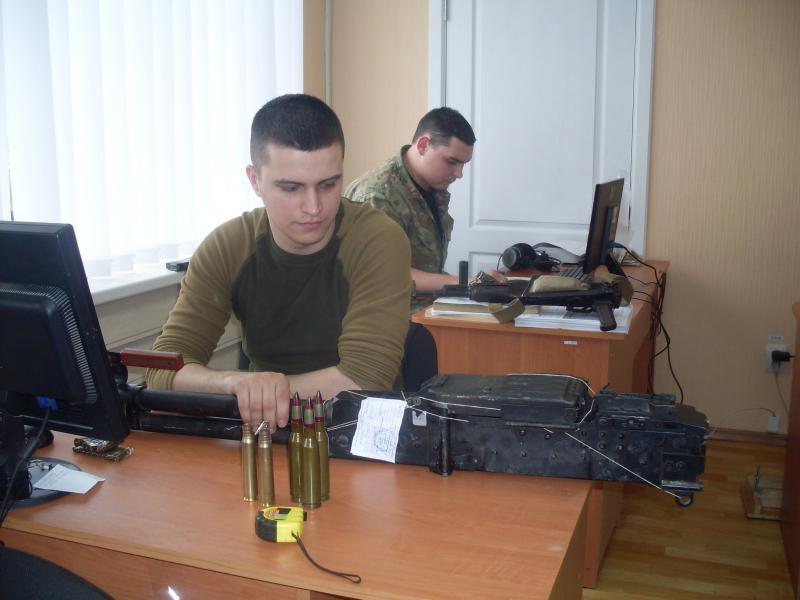 Исполняющий обязанности заведующего отделом исследования оружия Ростислав Олегович Гузиков объясняет нам специфику работы своего отдела. Специалисты отдела как раз анализировали боевое оружие, исследовали особенность его использования и технические характеристики.