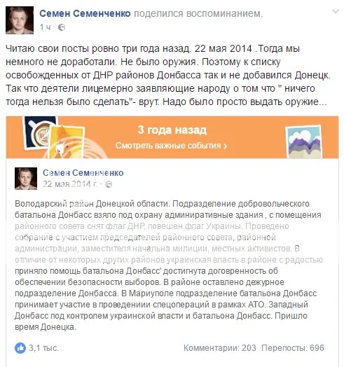 "Читаю свои посты ровно три года назад. 22 мая 2014 .Тогда мы немного не доработали. Не было оружия. Поэтому к списку освобожденных от ДНР районов Донбасса так и не добавился Донецк. Так что деятели лицемерно заявляющие народу о том что " ничего тогда нельзя было сделать"- врут. Надо было просто выдать оружие..." - написал нардеп.