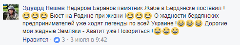 Другой пользователь отметил уместность в Бердянске одной из городских достопримечательностей – статуи Жабы, также известной как «Памятник жадности»: «О жадности бердянских предпринимателей уже ходят легенды по всей Украине! Дорогие мои жадные Земляки - Хватит уже Позориться!» - написал житель города.