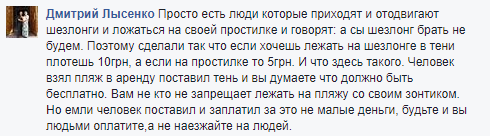 Однако один из подписчиков отметил, что услуга по продаже тени на пляже не такая уж и абсурдная, ведь не все отдыхающие хотят брать шезлонги, а просто ложатся на своих ковриках под навесом. И если предприниматель за свои деньги поставил этот навес, то можно ему и заплатить за предоставленный комфорт.