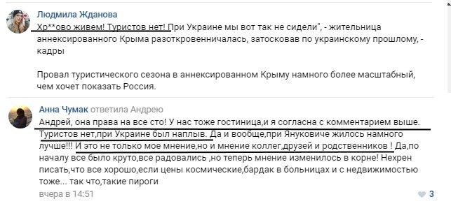 "Прочтите страдания ватницы за Януковичем (за Украиной — это “экстремизм”): “Туристов нет, при Украине был наплыв. Да и вообще, при Януковиче жилось намного лучше!!! И это не только мое мнение, но и мнение друзей, коллег, родственников! Да, поначалу было круто, все радовались, но теперь мнение изменилось в корне! Нехрен писать, что все хорошо, если цены космические, бардак в больницах и с недвижимостью”, - написал блогер.