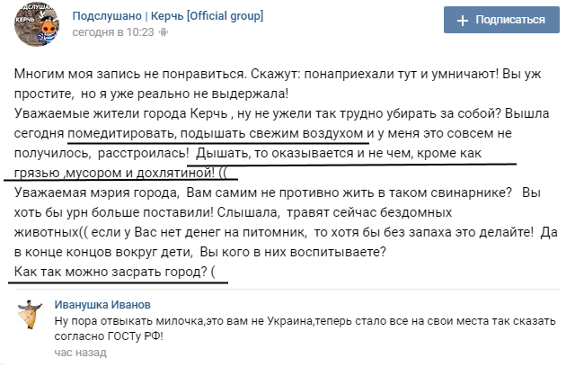 "Керчь Понаехавшим дурно пахнет. Странно-это же вы привезли СВОЮ грязь,вонь,мерзость и пр. скрепы. Чем не довольны? Дышите глубже-КРЫМВАШ", - написала RoksolanaToday&Крым и обнародовала скриншот записи в соцсети.