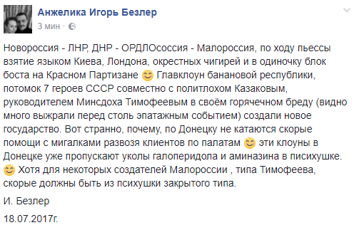 А извечный оппонент Захарченко Игорь Безлер просто посмеялся над «наполеоновскими» планами главаря «ДНР».