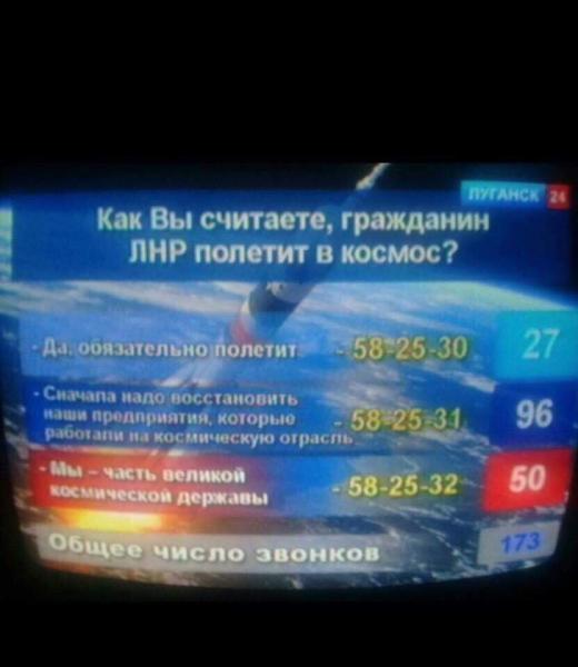 Как видно, телезрителям предлагалось ответить на вопрос, полетит ли гражданин "ЛНР" в космос. Большинство дозвонившихся придерживаются мнения, что сначала нужно восстановить предприятия, работающие на космическую отрасль. Часть респондентов считают себя частью "великой космической державы". Нашлись и те, кто твердо уверен, что гражданин "ЛНР" в космос обязательно полетит.