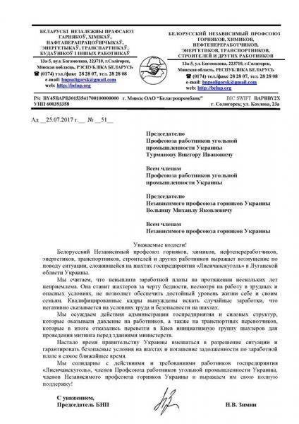 "Belarusian Independent Trade Union - Беларуска Незалежны прафсаюз возмущены ситуацией, сложившейся на ПАО "Лисичанскуголь" по долгосрочной задолженности по невыплате зарплаты шахтерам и поддерживают братьев-горняков в их борьбе!", - написал он.