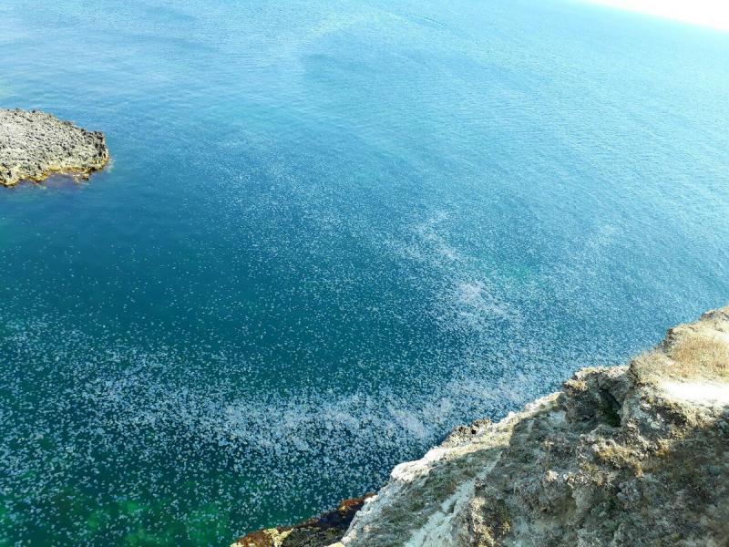 У берегов Крыма у мыса Тарханкут море заполонили медузы. Впечатляющие фото обнародовали пользователи соцсети.