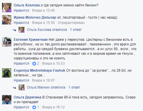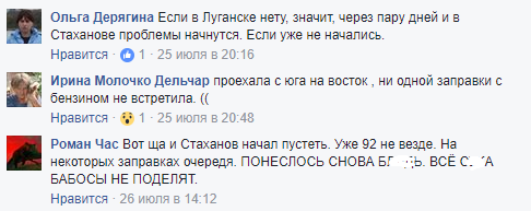 В обсуждении в группе "Регион 13 - Луганск" в Фейсбуке пользователи сообщают, что вслед за Луганском бензин пропал и в других городах ОРЛО, в частности, в Стаханове.