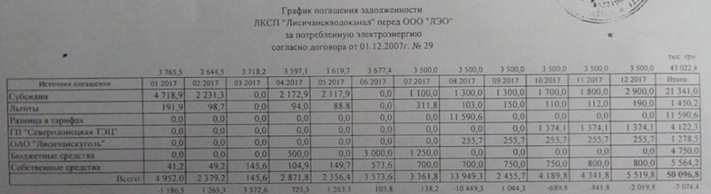 Разработан график погашения задолженности перед ООО «ЛЭО», из которого видно, что водоканал рассчитывает не на свои силы, а на погашение долгов, тарифной разницы и на субсидии.