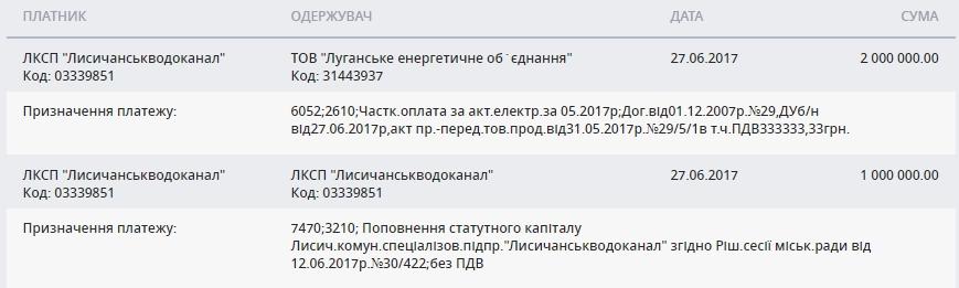 25 июля лисичанских депутатов проинформировали о том, что водоснабжающему предприятию надо выделить 1,25 млн. грн. для оплаты долгов за электричество, иначе грядет очередное отключение. В июне из местного бюджета уже ушел миллион. А на два миллиона раскошелилась область. Платежи можно посмотреть в реестре e-data https://spending.gov.ua/web/guest/transaction или здесь .