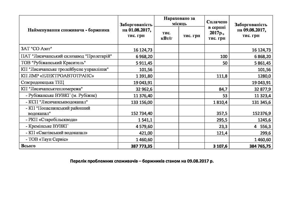 "Предлагаем Вашему вниманию перечень проблемных потребителей - должников за электроэнергию в Луганской области по состоянию на 9 августа, их уровень потребления и оплаты (на фото ниже, - ред.)", - сказано в сообщении.