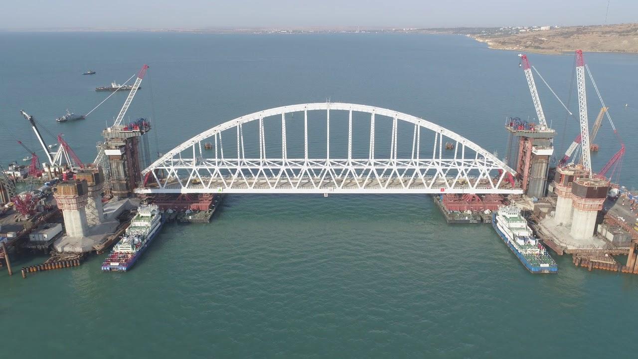 На аннексированном Россией полуострове начали устанавливать арочный пролет Керченского моста. Железнодорожную арку высотой 45 метров и длиной 227 метров доставили в пролив на плавучих опорах.