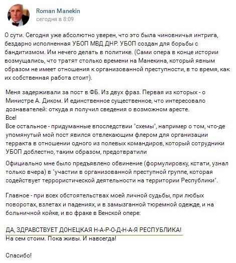 «Меня задерживали за пост в ФБ. Из двух фраз. Первая из которых - о Министре А. Диком. И единственное существенное, что интересовало дознавателей: откуда я получил сведения о возможном аресте Дикого. Все!», - заявил пропагандист Манекин днр.