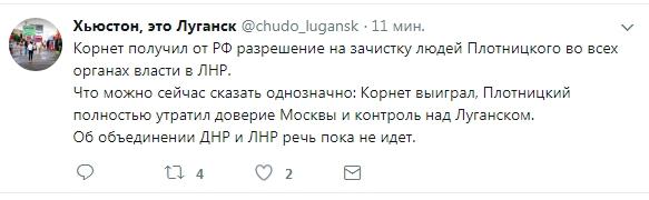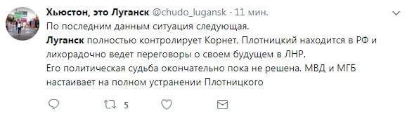 Пользователь под ником «Хьюстон, это Луганск» сообщает, что по последним данным главарь «ЛНР» Игорь Плотницкий сбежал в Россию и ведет переговоры о своем будущем в «республике». Город находится под контролем Игоря Корнета. Также блогер добавил, что РФ дала добро «главе МВД» на зачистку людей главаря боевиков.
