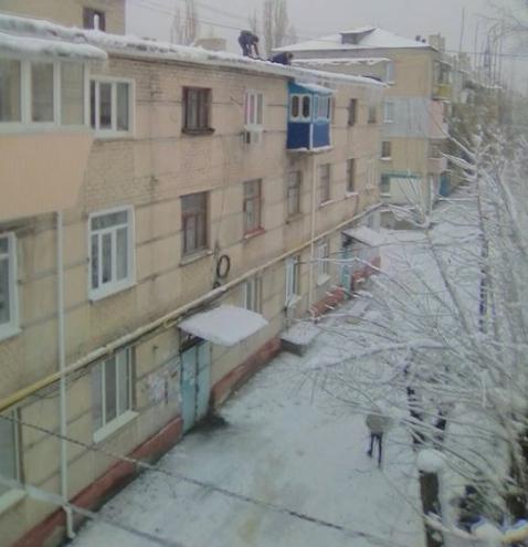 "3-й ЖЭК, район "Спутника", новые технологии сбивания сосулек: один лежит на крыше, сбивает сосульки молоточком, второй его держит за ноги... Внизу стоит мастер: "Женщина, закройте окно, вы мешаете мальчикам работать!"... На бензин для вышки денег нет, а мальчиков, видимо, много и их не жалко... Кто там у нас нынче начальствующий? Ау! совсем подурели?!", - гласит подпись к снимку.