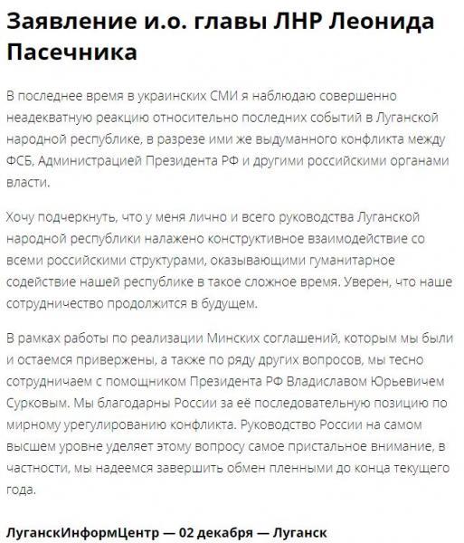 В заявлении Пасечника, опубликованного на сайте «ЛИЦ» говорится, что у него и всего «руководства ЛНР» налажено конструктивное взаимодействие с РФ. Он рассказал о тесном сотрудничестве с помощником российского лидера Владиславом Сурковым.