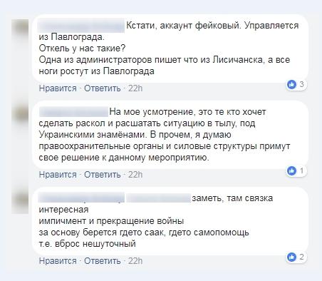 «Кстати, аккаунт фейковый. Управляется из Павлограда. Откель у нас такие? Одна из администраторов пишет, что из Лисичанска, а все ноги растут из Павлограда», - пишет Кобзарь.