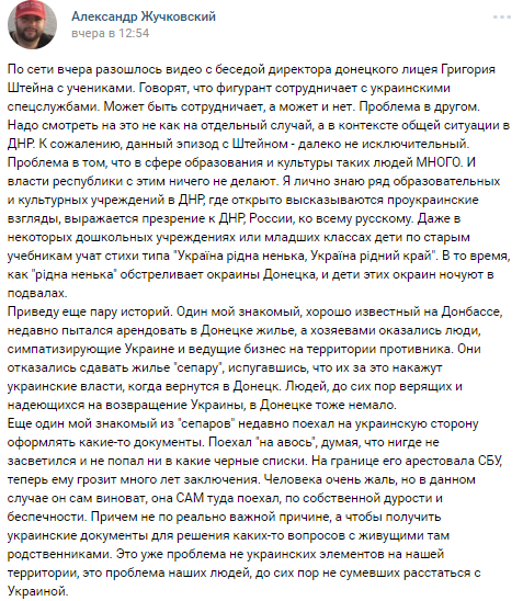 Террорист заявляет, что проукраински настроенных граждан много в образовательной и культурной сфере, и «власти» не спешат с этим разбираться. По словам Жучковского, ему известны учреждения, где открыто говорят о любви к Украине и презрении к «республикам» и России, где дети учат стихи про «рідну неньку Україну».