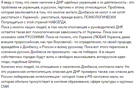 Жучковский сетует, что многие жители «ДНР», включая так называемых «ополченцев» и главарей «республики», все еще психологически сильно зависят от Украины, и пока в их сознании не произойдет «перелом», «русскому миру» победить не удастся.