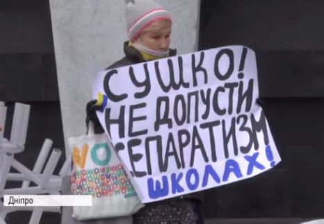 Жители Днепра возмущены тем, что в украинских школах продолжается преподавание предметов на русском языке. По этому поводу под городским советом провели митинг.