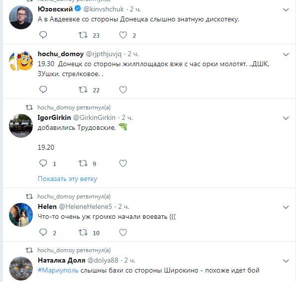 "Донецк Площадка… дурдом начинается. Северный поселок/Октябрьский слушаем разное. Вольво/Пески, прям по расписанию", "Сторона Песок стрелковое с к/к и бахами", "Донецк шахта 31 слушаем в стороне Песок идет перестрелка Магистральный слышно идет бой", "Донецк Северный/Застанционный. Сторона Песок воюет всем подряд. Азотный слушает. Плотный бой. Октябрьский, громко 1-я площадка, понеслось и крепенько. Что-то ни дня покоя нет", "Донецк Северный поселок громко. Такое впечатление, что под окнами бегают. Жесть. На Топазе громко Это что за жесть, Смолянка аж трясется, Октябрьский опять отдувается","Сторона ДАП-Пески похоже тоже активно воюет. Нон-стоп стрельба", - пишут в пабликах жители ОРДЛО.