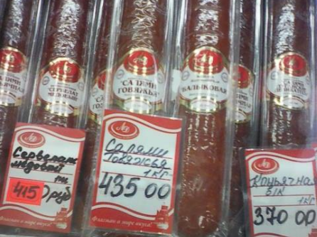Но это еще далеко не самая дорогая колбаса. В супермаркете "Spar" можно найти продукт, "сделанный в ЛНР", с заоблачными ценами: колбаса "Амаретто" "отечественного производства" продается за 777,90 руб. за кг (360 грн.), "Московская" стоит 914, 40 руб. (423 грн.).