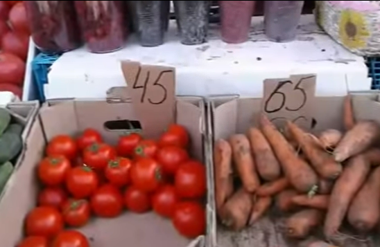 Как видно, на горловском рынке представлен стандартный ассортимент сезонных овощей. Крупный картофель в переводе на украинскую валюту стоит 12 грн., мелкий - 9 грн., огурцы - 14 грн., баклажаны - 20 грн., кабачки - 8 грн., помидоры - от 18 до 25 грн., морковь - 27 грн., лук - 11,50 грн., капуста - 4,18 грн., кукуруза - 10 грн., арбуз - 12,50 грн.