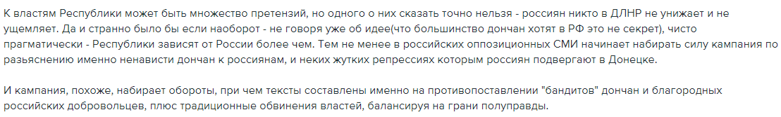 По заявлению блогера, некоторые российские журналисты и СМИ пишут о том, как российских "добровольцев" унижают и ущемляют в "ЛДНР". Среди конкретных примеров такой информации пропагандист отметил: "россиян-добровольцев, погибших и раненных списывают задним числом", "россиян-ополченцев арестовывают, шьют им шпионаж в пользу РФ и пытают", "россиян ненавидят в Донецке". По словам "Донецкого", многие из таких заявлений не соответствуют действительности.