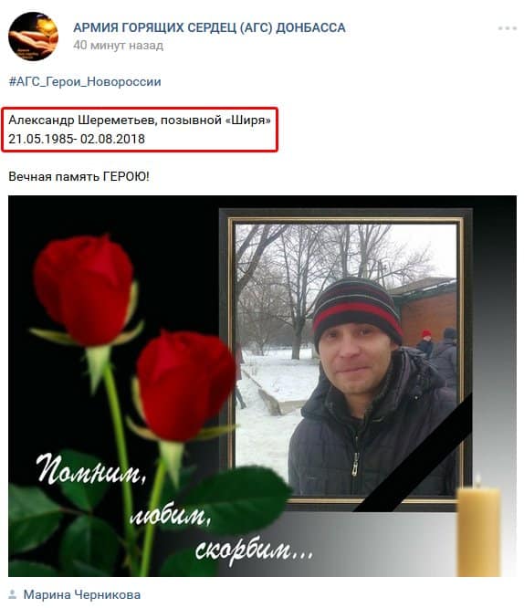 "#200_бригада 02.08.18 пополнилась очередным дембелем #ДМБ, Шереметьев Александр "Ширя" из Горловки, зарезан в ходе пьянки братушаней - сослуживцем из "Оплота", - написал военный.