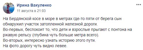 "На Бердянской косе в море в метрах где-то пяти от берега сын обнаружил участок затопленной железной дороги.