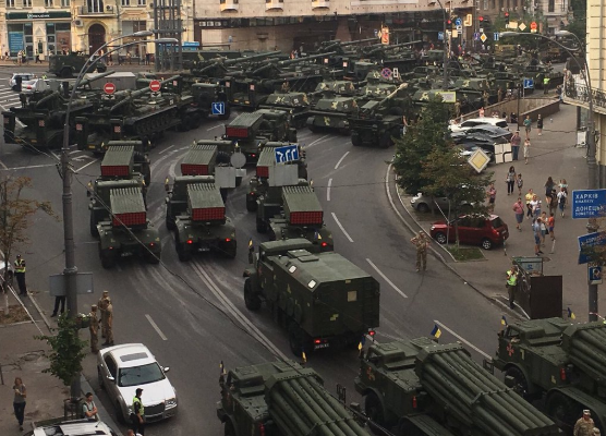 Накануне, вечером 18 августа, в Киеве прошла генеральная репетиция парада. Техники было так много, что она едва уместилась на дороге. Соответствующее фото опубликовали в соцсетях.