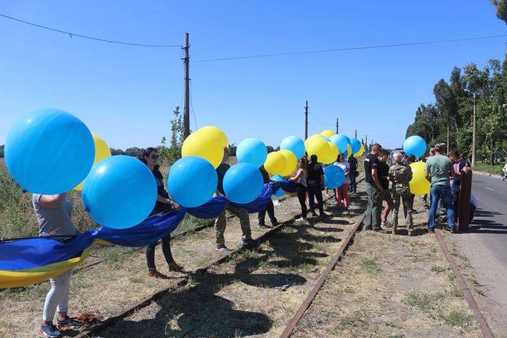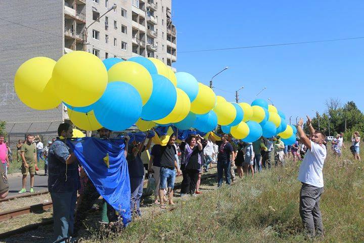 И вот, когда все участники акции одновременно отпустили флаг и пели Гимн Украины, огромный государственный символ нашей Родины стремительно поднялся в небо и уверенно поплыл в сторону Донецкого аэропорта, с целью напомнить всем жителям оккупированных территорий: Украина помнит о вас!