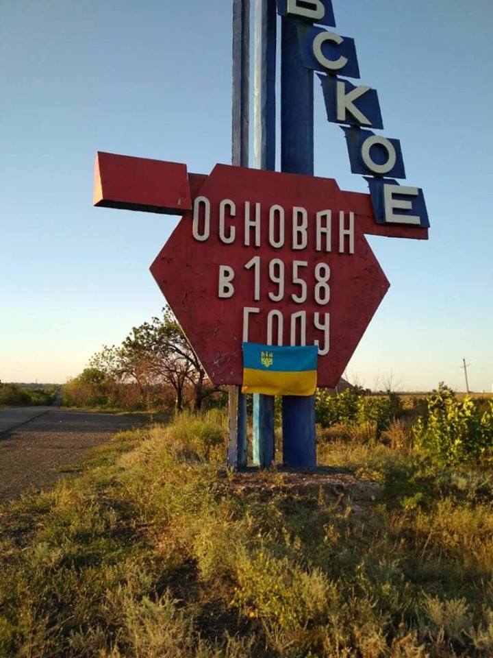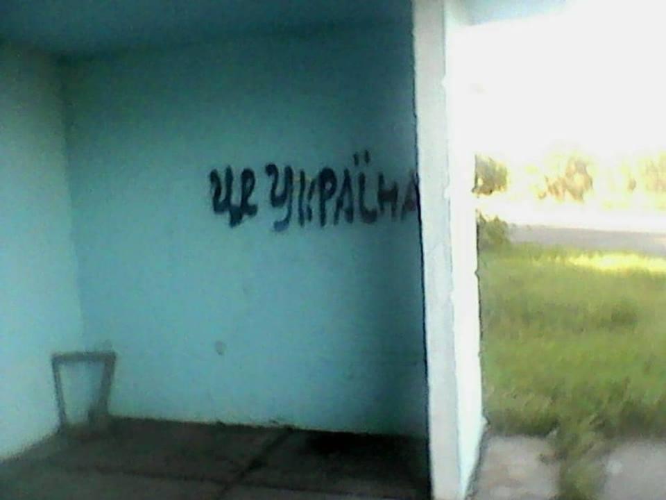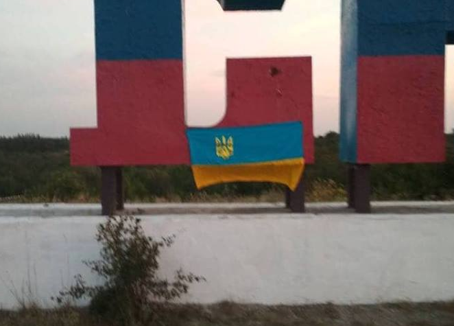 Украинские флаги появились на стелах при въезде в населенные пункты. Кроме того, на остановках общественного транспорта и других местах появились надписи "Это Украина" и "Мы с Украиной".