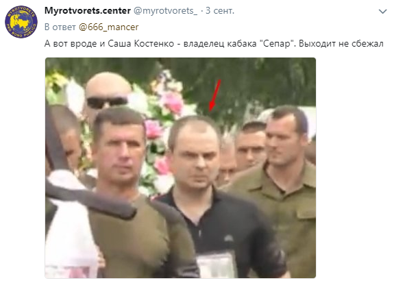 Среди присутствовавших на церемонии опознали Александра Костенко - бывшего начальника личной охраны Захарченко и владельца взорванного кафе "Сепар". Ранее в сети ходили слухи, что он сбежал, опасаясь, что вину за убийство главаря "ДНР" повесят на него.
