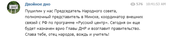 "Пушилин у нас Председатель Народного совета, полномочный представитель в Минске, координатор внешних связей с РФ по программе «Русский центр». Сегодня он еще будет назначен врио Главы ДНР и возглавит правительство", - пишет Телеграм-канал "Двойное дно".