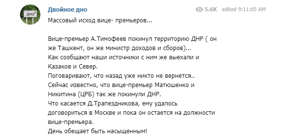 "Вице-премьер А.Тимофеев покинул территорию ДНР ( он же Ташкент, он же министр доходов и сборов)... Как сообщают наши источники с ним же выехали и Казаков и Север. Поговаривают, что назад уже никто не вернется.. Сейчас известно, что вице-премьер Матюшенко и Никитина (ЦРБ) так же покинули ДНР. Что касается Д.Трапездникова, ему удалось договориться в Москве и пока он остается на должности вице-премьера", - говорится в сообщении.