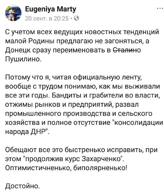 "Предлагаю не загоняться, а Донецк сразу переименовать в Пушилино", - говорится в одном из постов.