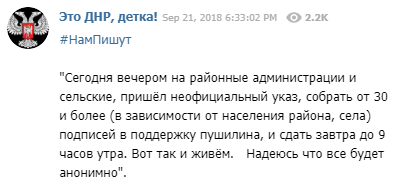 "Республиканские" СМИ принялись активно пиарить нынешнего "вр.и.о. главы", а в различных райадминистрациях "добровольно-принудительно" собирают подписи в поддержку Пушилина, передает Час Пик.