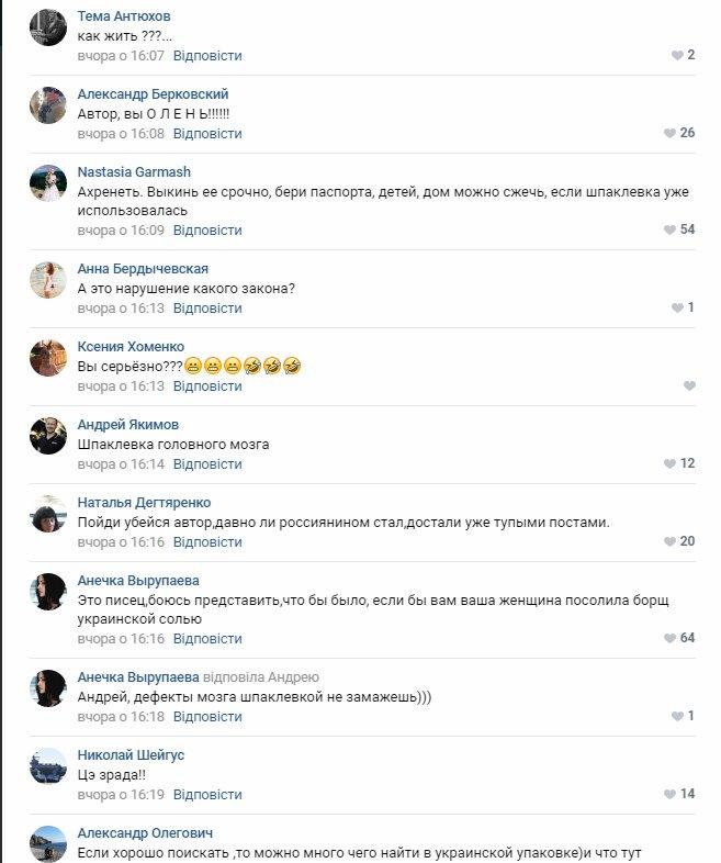 Однако большинство пользователей не поддержали возмущение автора поста и начали откровенно его троллить. "Понаехавшему" в шутку посоветовали сжечь дом и бежать, если шпаклевка уже использовалась. Также комментаторы отметили, что украинская продукция, как правило, качественнее.